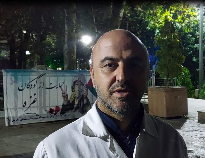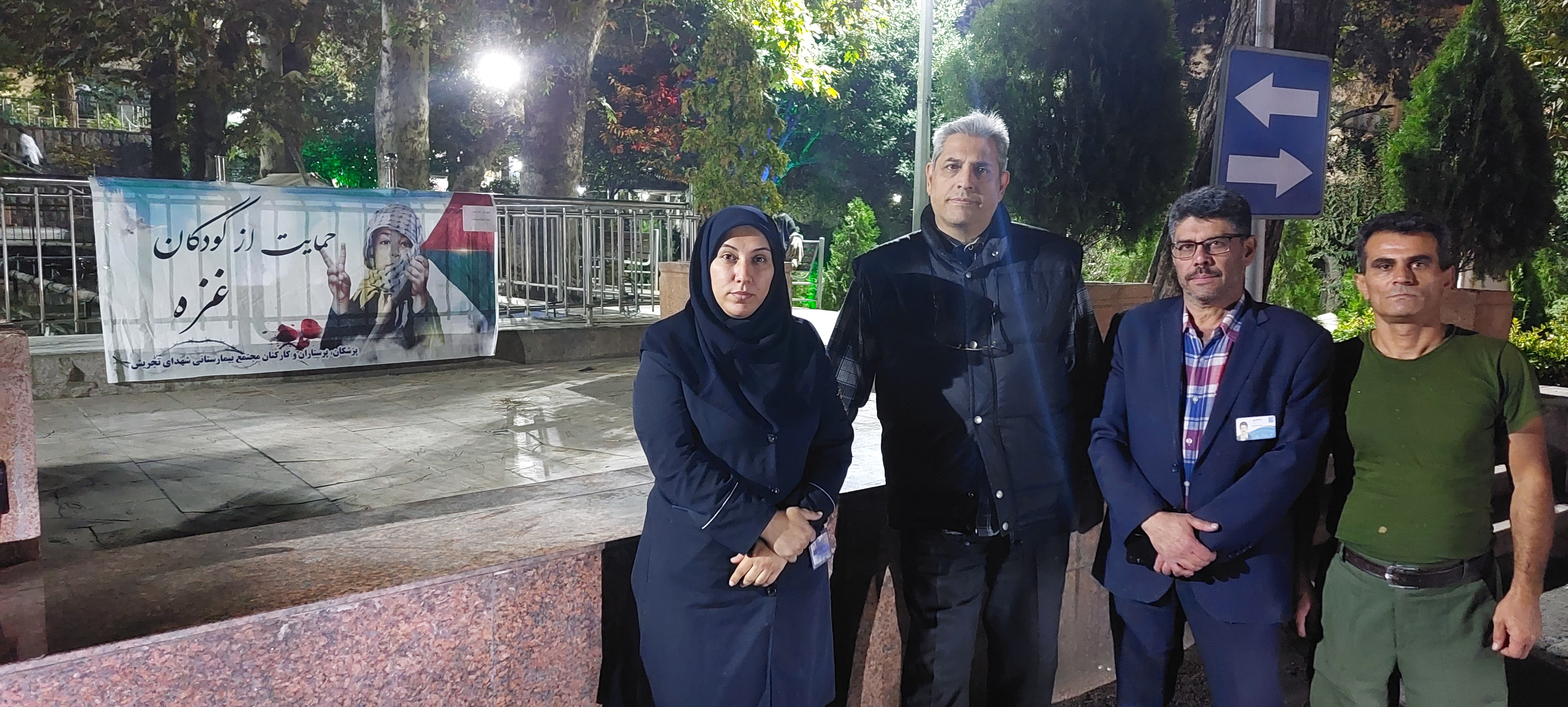 حضور جناب آقای عباس نیا ریاست محترم اداره مشارکت های سازمان خدمات و مشارکت های اجتماعی شهر داری تهران در جمع کار کنان بیمارستان شهدای تجریش در حمایت از مردم غزه بیستو ششم مهر ماه 1402